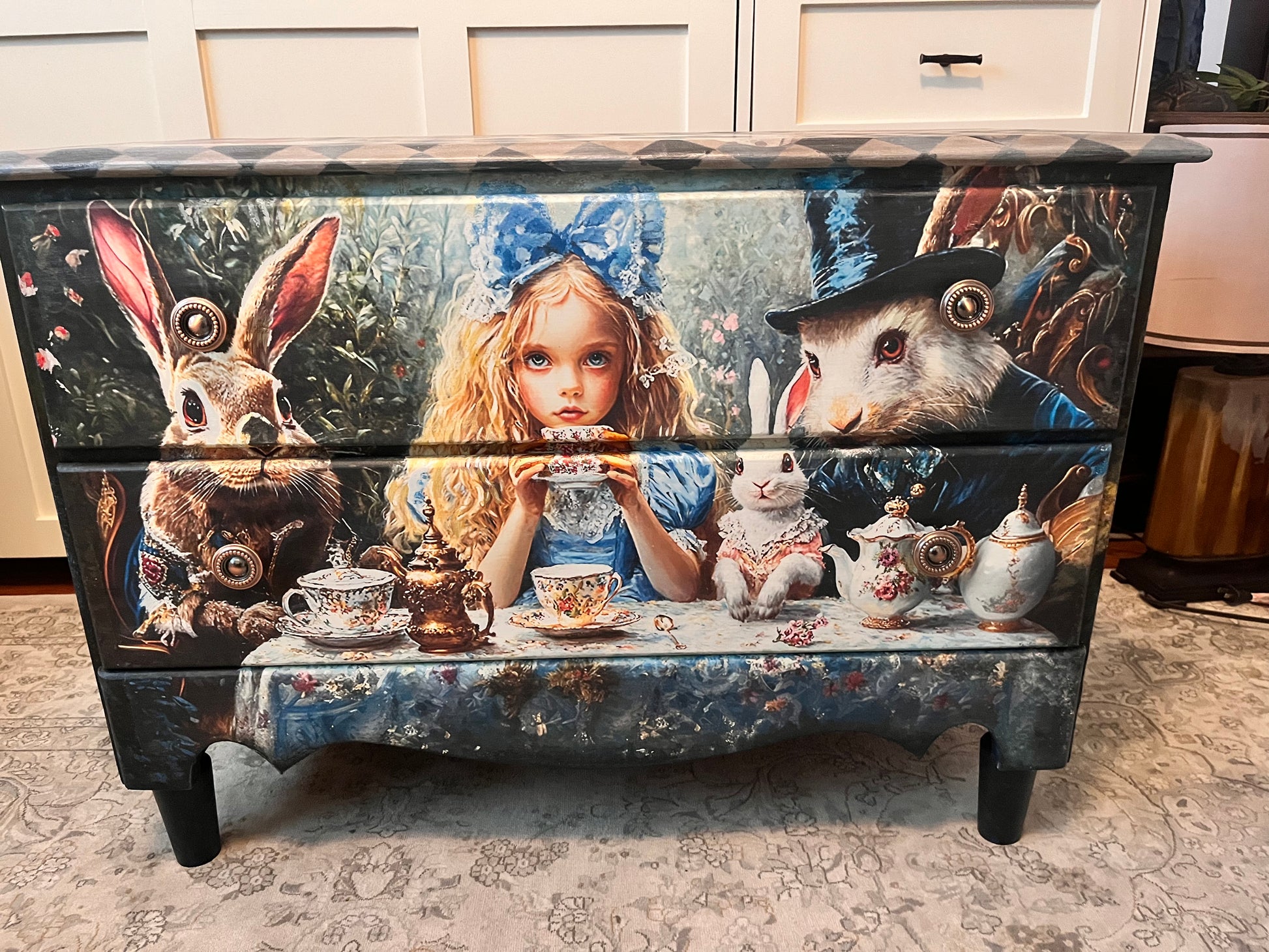 A decoupage print featuring a young girl and rabbits at a tea party, with a blue and white theme.